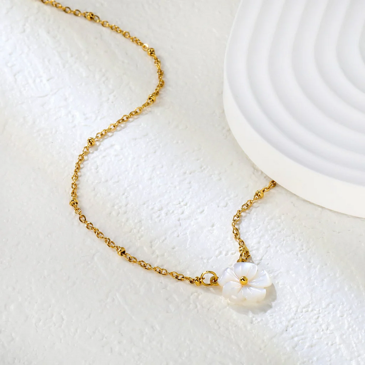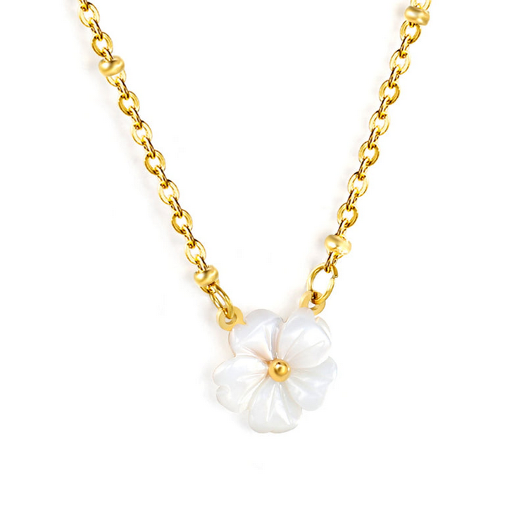 Add a touch of soft elegance to your jewellery collection with this White Shell Peach Blossom Flower Necklace. Designed with a delicate 12.5mm flower clasp made from natural white shell, this necklace reflects timeless beauty with a feminine charm.